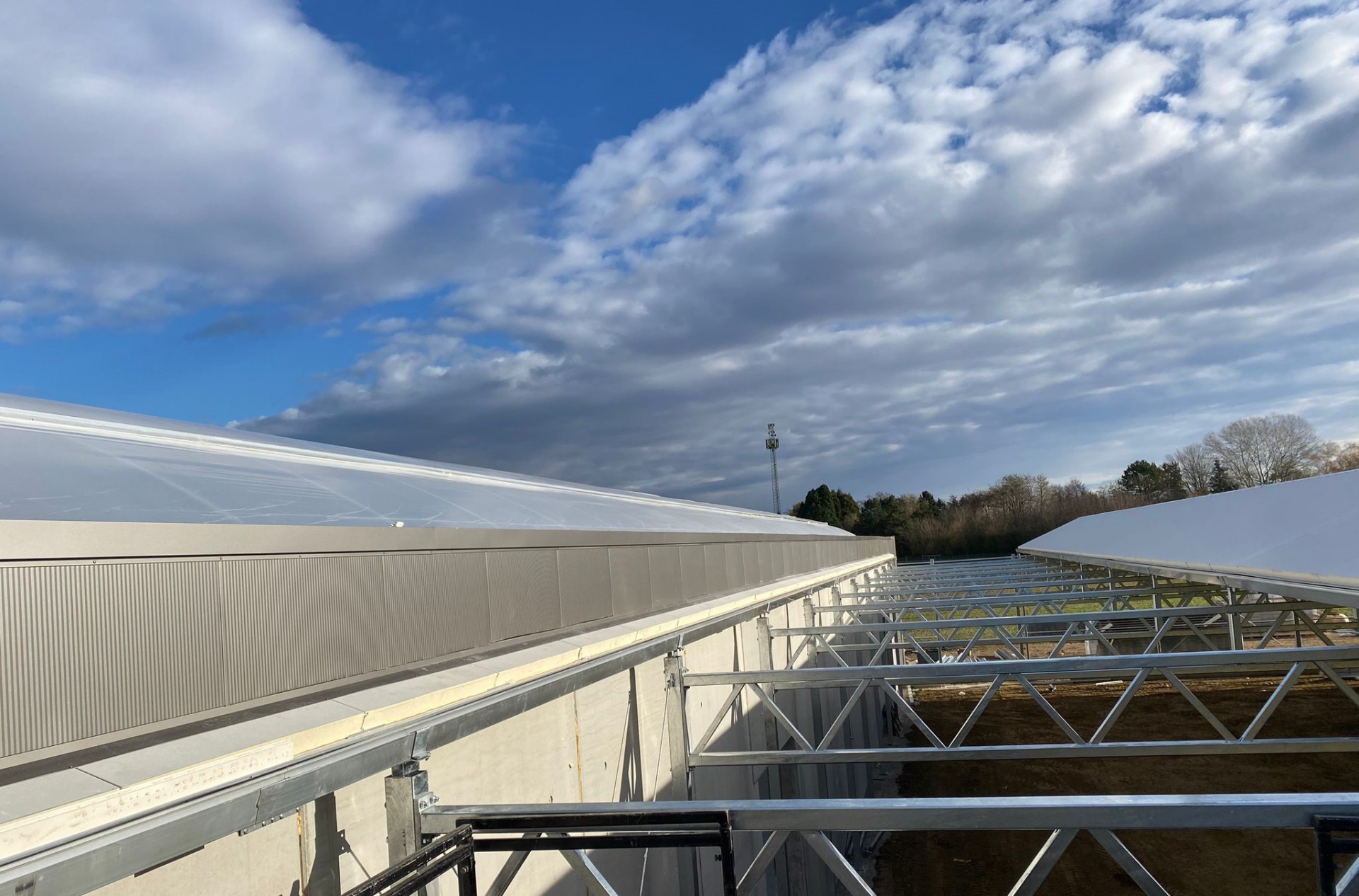 De foliekas en de bedrijfsruimte zijn gescheiden door een brandwerende betonwand. Teneinde deze wand netjes te integreren is deze deels bekleed met steenwol sandwichpanelen. Ten tijde van deze reportage was de betonvloer nog niet overal aangebracht. Binnenkort wordt dit verzorgd en kunnen we de laatste fase van het project afronden door de koelcel te plaatsen.
